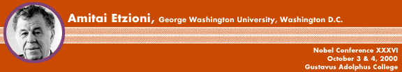 University Professor, The George Washington University, Washington, D.C. A former senior adviser to the White House (1979-80), Amitai Etzioni is popularly known as the "guru" of the communitarian movement and an advocate for advancing human values in public policy. He is the founder and first president (1989-90) of the international Society for the Advancement of Socio-Economics. Etzioni was born in Koln, Germany, and earned his bachelors and masters degrees from The Hebrew University, Jerusalem, before enrolling at the University of California, Berkeley, where he was awarded a Ph.D. in 1958. After a 20-year tenure as professor of sociology at Columbia (1958-1978), he was selected as a guest scholar at the Brookings Institution, served as a senior adviser for the Bush administration, and then joined the faculty of The George Washington University in 1980 as that institutions first University Professor. In 1968 he was named director of the Center for Policy Research at Columbia, a position he still holds. Etzioni has been editor or editorial board member for a number of sociological and social policy journals, including The Responsive Community: Rights and Responsibilities, a communitarian quarterly which he founded. He is the author of 19 books, including The Moral Dimension: Toward a New Economics (1988) and, most recently, The Limits of Privacy (1999). In 1998, he was awarded the James Wilbur Award for Extraordinary Contributions to the Appreciation and Advancement of Human Values by the Conference on Value Inquiry. |