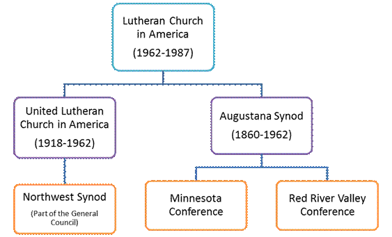 The Northwest Synod, which began in 1891, was part of the United Lutheran Church in America. The Northwest Synod dissolved when the United Lutheran Church in America and the Augustana Evangelical Lutheran Synod merged with two other church bodies to form the Lutheran Church in America during 1962. The Augustana Synod was organized in 1860 and eventually included the Minnesota and Red River Valley conferences. When the Lutheran Church in America was created, the Northwest Synod was dissolved and its congregations were absorbed into new Synods. The Minnesota and Red River Valley conferences subsequently grew and were renamed as Synods.